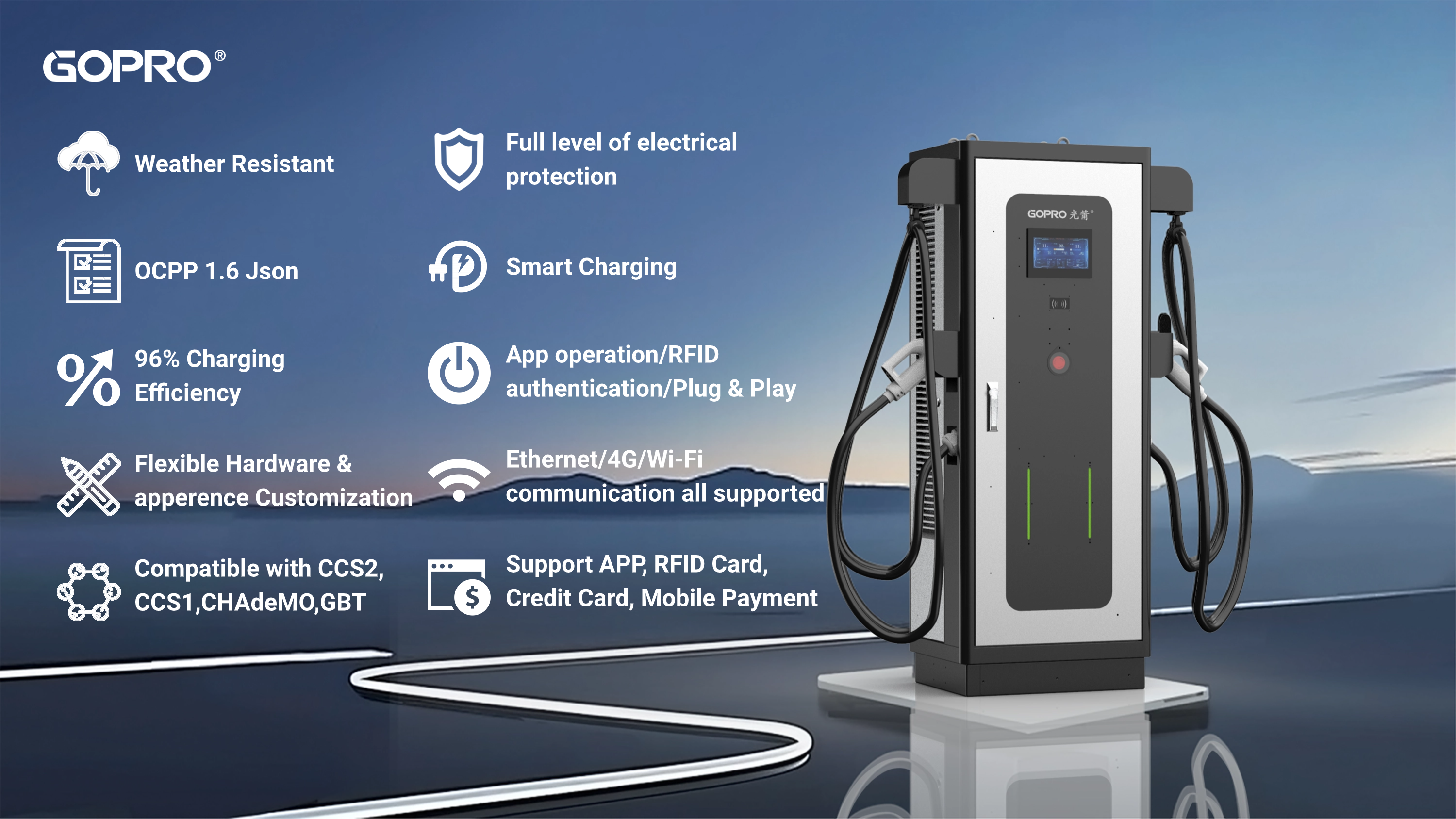 Power up your EV experience with cutting-edge technology designed for reliability and convenience.Here’s why GOPRO stands out:Weather Resistant & Ultra-Safe: Built to endure harsh conditions with full electrical protection.Smart Charging, Smarter Efficiency: OCPP 1.6 Json compatibility + 96% charging efficiency for maximum energy savings.Plug & Play Simplicity: Start charging instantly via App, RFID card, ...