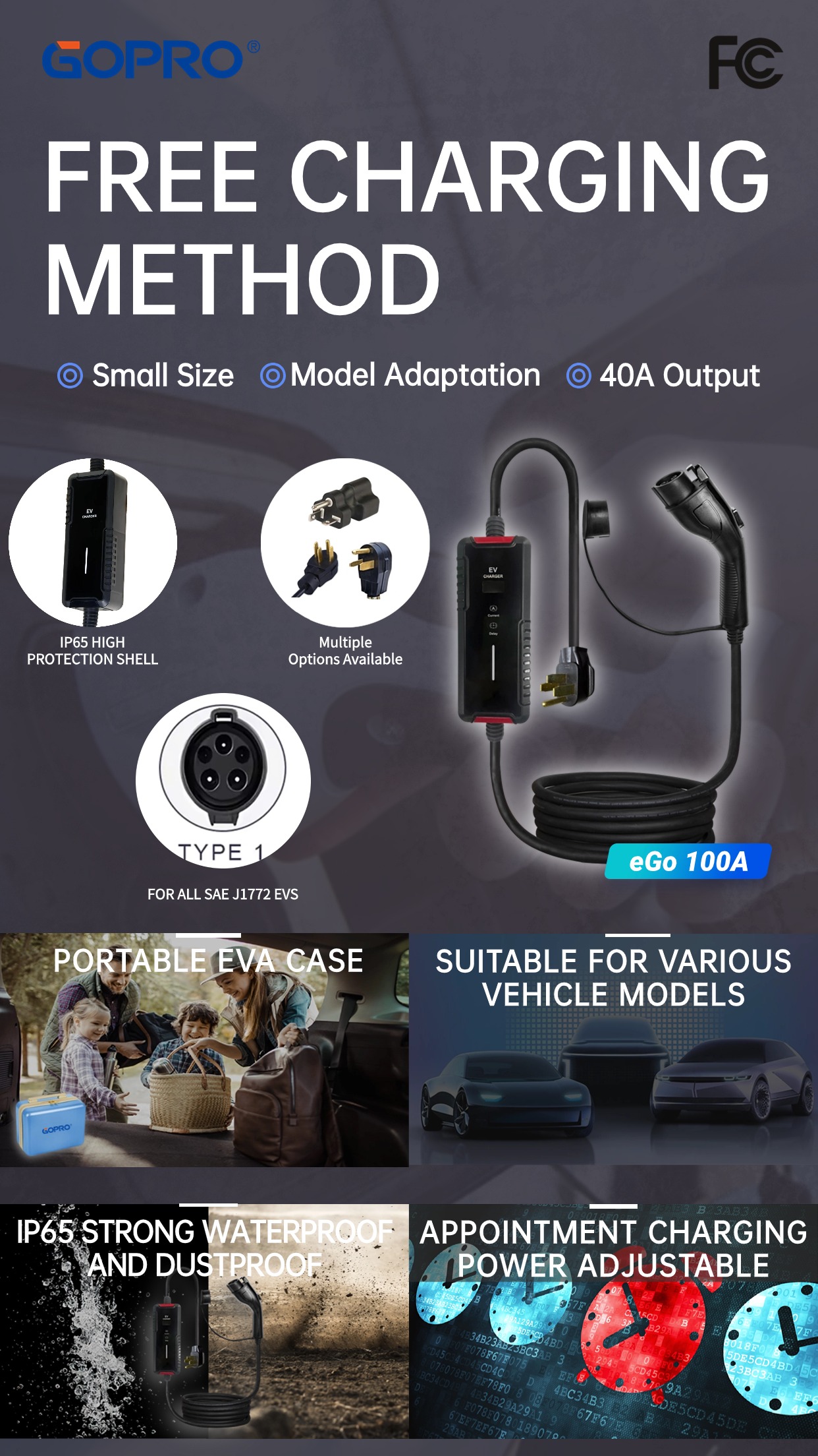 In a world where efficiency meets innovation, the eGo 100A Charger by GOPRO redefines what it means to charge your electric vehicle. Designed for versatility, durability, and unmatched performance, this compact powerhouse is engineered to keep you moving forward—no matter where the road takes youWhy Choose the eGo 100A?1.Universal CompatibilityCompatible with all SAE J1772 EVs,the eGo 100A ensures seamless chargin...