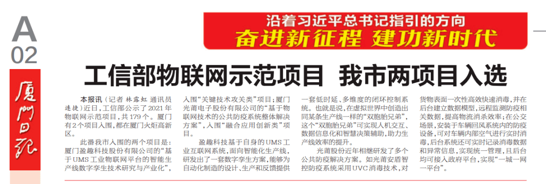 克日,,,,,,工业和信息化部公示了2021年物联网树模项目,,,,,, 天下共179个项目入选。。。。。。。。福建省11个项目入围,,,,,,仅次于北京,,,,,,排名天下第二。。。。。。。。其中,,,,,, 厦门有2家项目入选,,,,,,j9游国际站官网股份名列其中 !